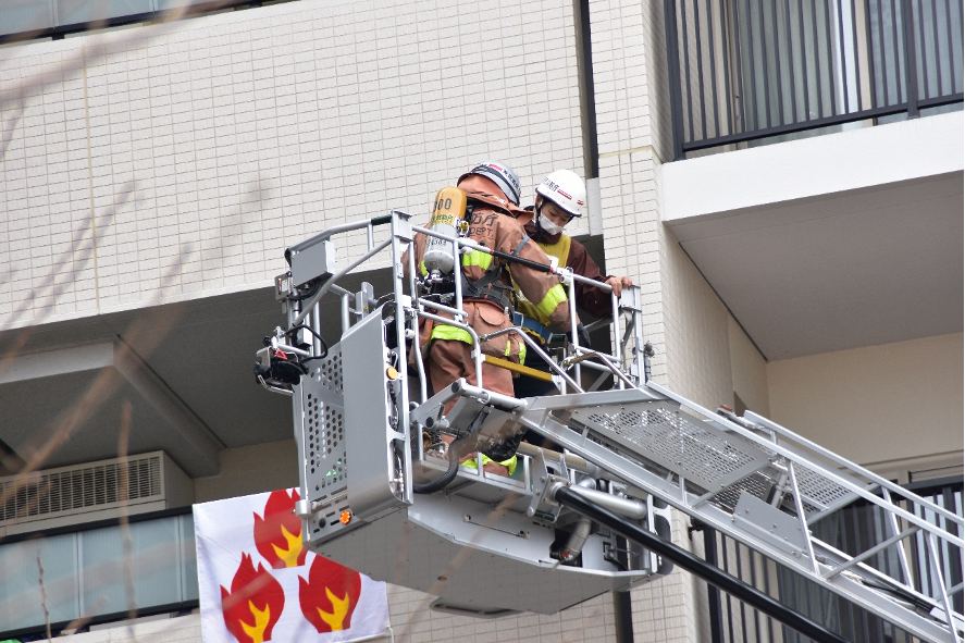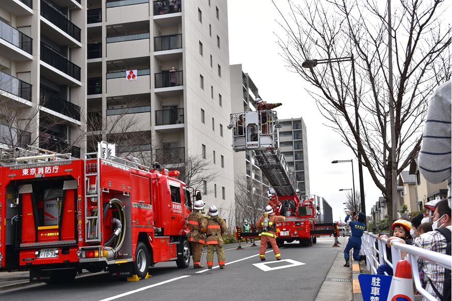 テラス118前のシティテラスひばりが丘から出火。ベランダに取り残され救助を求める住民をはしご車が出動して助けるという訓練からスタートしました。