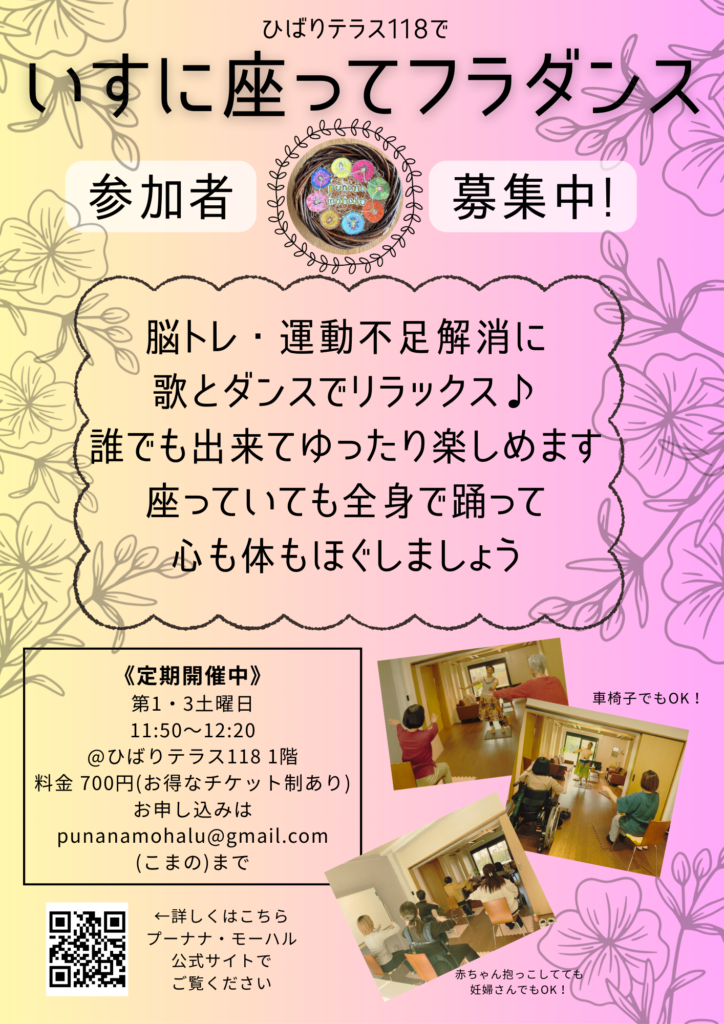 西東京市・東久留米市を拠点に活動しています。 小さくて風通しの良い空間で、大人クラス・幼児~小学生クラス・中学生クラス・いすに座って踊る会・ウクレレクラブ・・・ 全クラス少人数&アットホームにレッスンを開催中。 (いすに座ってフラダンスは田無駅近くの多世代交流施設「どんぐり」でも木曜日に定期開催しています)