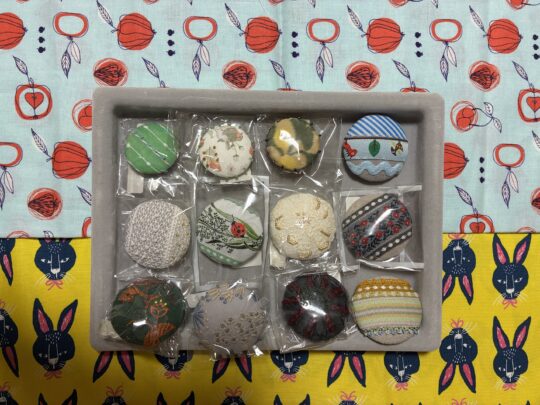 くるみボタンを2つ重ねて、マカロンみたいなストラップを作ります。