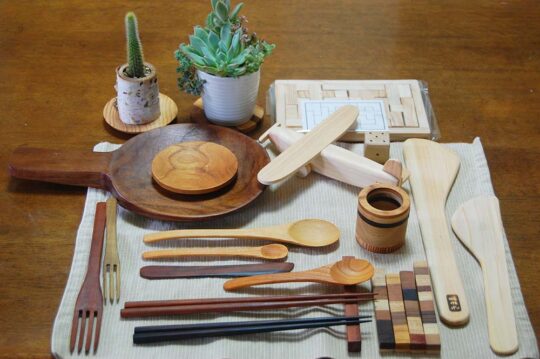▷木製生活雑貨、アクセサリー、箸、カトラリー、多肉植物など
